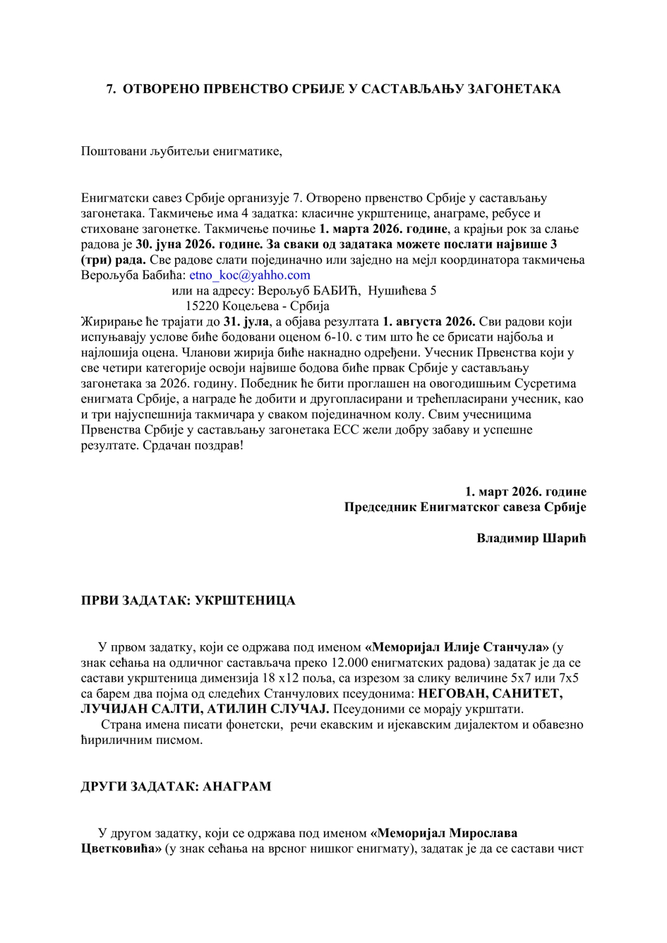 6. ОТВОРЕНОГ ПРВЕНСТВА СРБИЈЕУ САСТАВЉАЊУ ЗАГОНЕТАКА