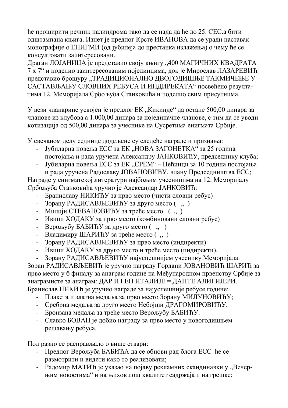 Записник са седнице урадио је Александар Ацо ЈАНКОВИЋ и објављен је на сајту ЕК "Нова загонетка".