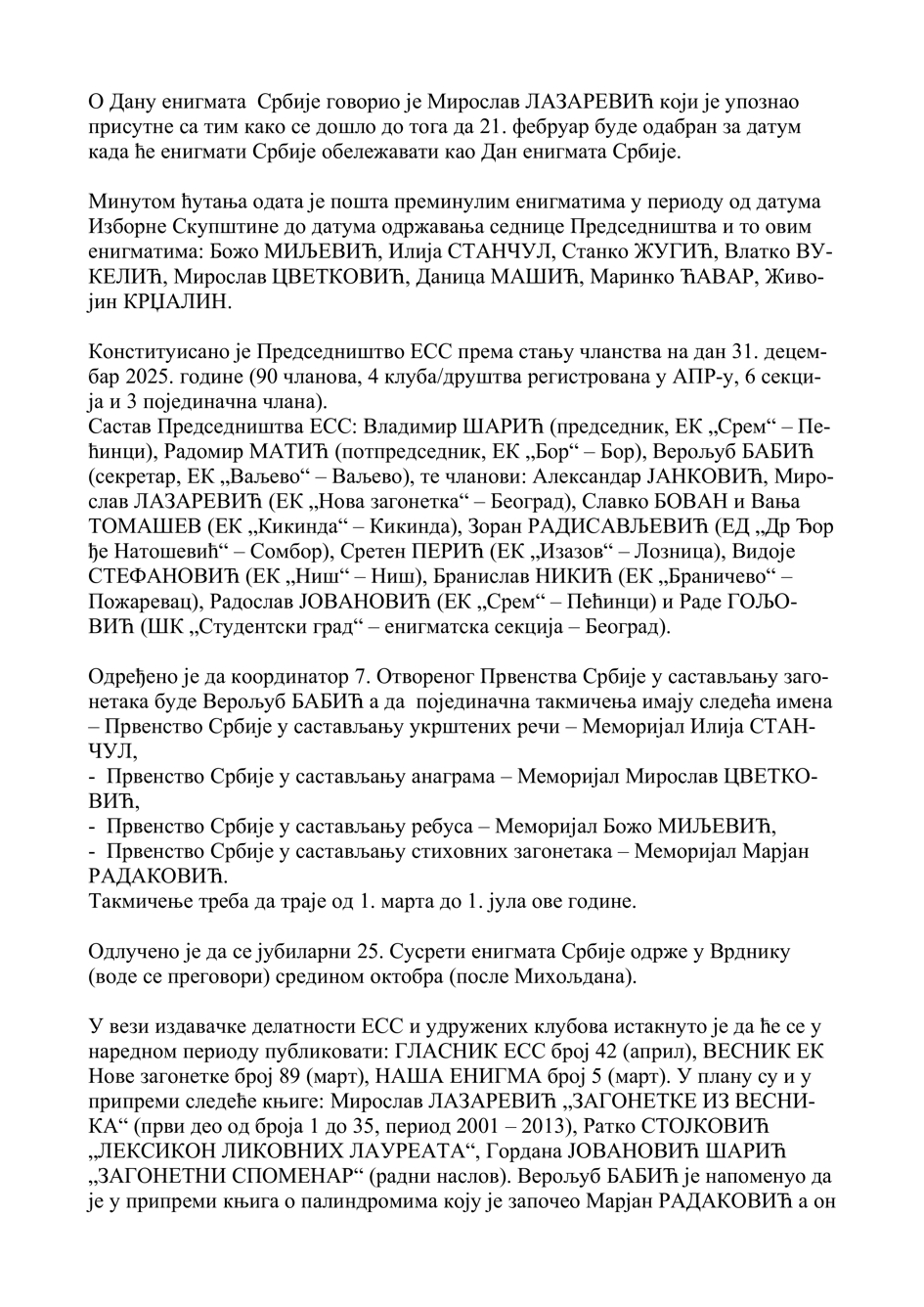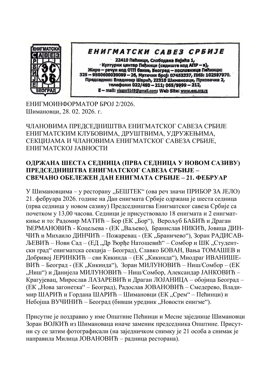 обраћам Вам се поводом одржавања ПРВЕ СЕДНИЦЕ ПРЕДСЕДНИШТВА ЕСС у новом сазиву, која би требало да се обави 21. фебруара 2026. г. на Дан енигмата Србије а који пада у суботу, па би било добро да тада свечано обележимо наш дан. Највероватније је да ће се ова седница одржати у Шимановцима а поводом 10 година постојања ЕК Срем, уз спонзорство Месне заједнице Шимановци и Општине Пећинци.