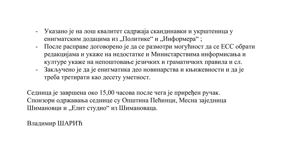 Записник са седнице урадио је Александар Ацо ЈАНКОВИЋ и објављен је на сајту ЕК "Нова загонетка".